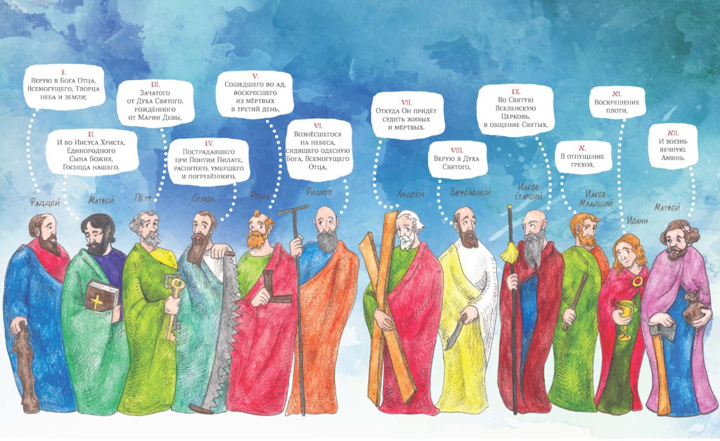Проиллюстрированный «Символ веры» знакомит читателей с учениками Христа и элементами их жизнеописания: каждый из апостолов держит в руках определенный символический атрибут. По традиции, апостолы, собравшиеся в горнице в день Пятидесятницы (Деян. 1, 13), исповедывали свою веру.